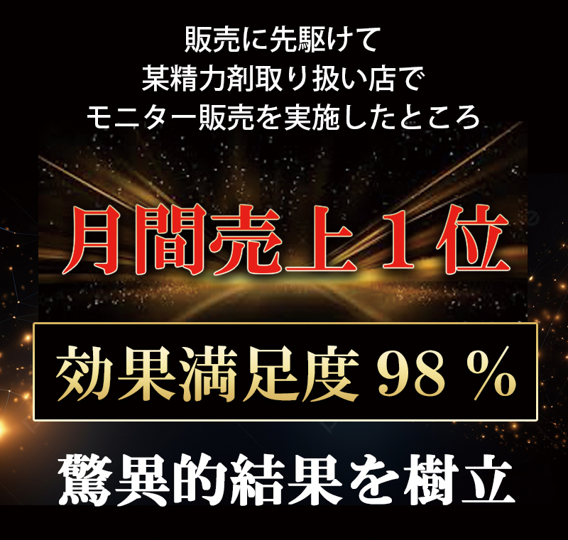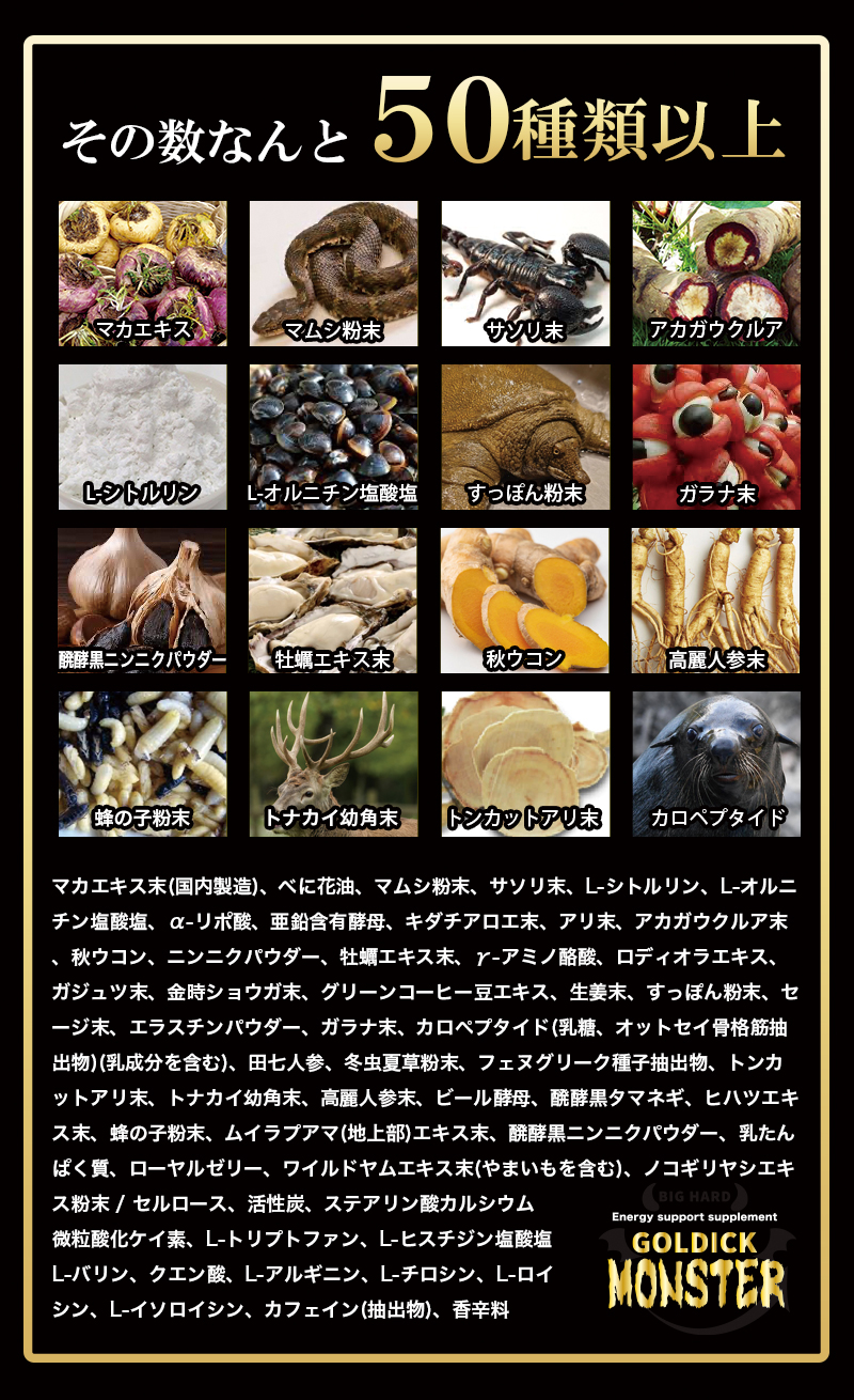 | 原材料名 | マカエキス末(国内製造)、べに花油、マムシ粉末、サソリ末、L-シトルリン、L-オルニチン塩酸塩、α-リポ酸、亜鉛含有酵母、キダチアロエ末、アリ末、アカガウクルア末、秋ウコン、ニンニクパウダー、牡蠣エキス末、γ-アミノ酪酸、ロディオラエキス、ガジュツ末、金時ショウガ末、グリーンコーヒー豆エキス、生姜末、すっぽん粉末、セージ末、エラスチンパウダー、ガラナ末、カロペプタイド(乳糖、オットセイ骨格筋抽出物)(乳成分を含む)、田七人参、冬虫夏草粉末、フェヌグリーク種子抽出物、トンカットアリ末、トナカイ幼角末、高麗人参末、ビール酵母、醗酵黒タマネギ、ヒハツエキス末、蜂の子粉末、ムイラプアマ(地上部)エキス末、醗酵黒ニンニクパウダー、乳たんぱく質、ローヤルゼリー、ワイルドヤムエキス末(やまいもを含む)、ノコギリヤシエキス粉末 / セルロース、活性炭、ステアリン酸カルシウム、微粒酸化ケイ素、L-トリプトファン、L-ヒスチジン塩酸塩、L-バリン、クエン酸、L-アルギニン、L-チロシン、L-ロイシン、L-イソロイシン、カフェイン(抽出物)、香辛料 |