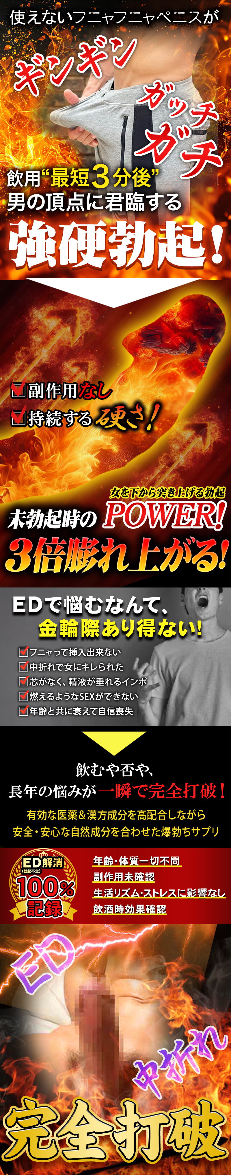 | 原材料名 | 冬虫夏草粉末(国内製造)、L-シトルリン、ムイラプアマ(地上部)エキス末、ワイルドヤムエキス末(ワイルドヤムエキス、マルトデキストリン)(やまいもを含む)、マムシ粉末、マカパウダー、トンカットアリ末、田七人参、すっぽん粉末、カンカニクジュヨウエキス、醗酵黒ニンニクパウダー、ローヤルゼリー、高麗人参末、牡蠣エキス末(牡蠣エキス、タピオカデキストリン)、蜂の子粉末、亜鉛含有酵母、カロペプタイド(乳糖、オットセイ骨格筋抽出物)(乳成分を含む)、フェヌグリーク種子抽出物、ブラックジンジャー抽出物(ブラックジンジャー抽出物、デキストリン)、馬睾丸エキス末 / セルロース、ステアリン酸カルシウム、微粒酸化ケイ素、L-アルギニン、L-トリプトファン、シクロデキストリン |