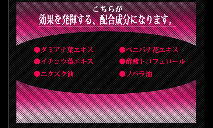 | 原材料名 | 水、グリセリン、セタノール、BG、パルミチン酸エチルヘキシル、ステアリン酸グリセリン(SE)、シクロペンタシロキサン、ジメチコン、ダミアナ葉エキス、ベニバナ花エキス、イチョウ葉エキス、酢酸トコフェロール、ニクズク核油、ノバラ油、(アクリル酸ヒドロキシエチル/アクリロイルジメチルタウリンNa)コポリマー、ステアリン酸ソルビタン、エタノール、EDTA-4Na、香料、メチルパラベン、プロピルパラベン、赤106 |