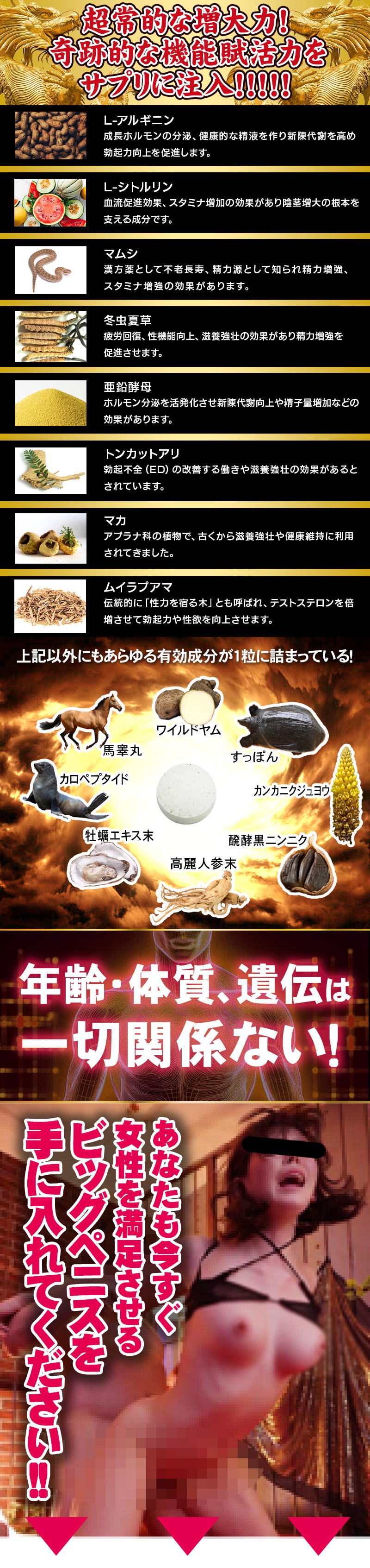 | 原材料名 | 冬虫夏草粉末(国内製造)、L-シトルリン、ムイラプアマ(地上部)エキス末、ワイルドヤムエキス末(ワイルドヤムエキス、マルトデキストリン)(やまいもを含む)、マムシ粉末、マカパウダー、トンカットアリ末、田七人参、すっぽん粉末、カンカニクジュヨウエキス、醗酵黒ニンニクパウダー、ローヤルゼリー、高麗人参末、牡蠣エキス末(牡蠣エキス、タピオカデキストリン)、蜂の子粉末、亜鉛含有酵母、カロペプタイド(乳糖、オットセイ骨格筋抽出物)(乳成分を含む)、フェヌグリーク種子抽出物、ブラックジンジャー抽出物(ブラックジンジャー抽出物、デキストリン)、馬睾丸エキス末 / セルロース、ステアリン酸カルシウム、微粒酸化ケイ素、L-アルギニン、L-トリプトファン、シクロデキストリン |